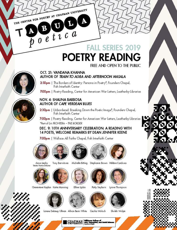Celebrating the 10th Anniversary of Tabula Poetica, I’ll be reading poems on Monday, December 9 at Chapman University! The roster of readers includes: Anna Leahy; Maureen Alsop, Tony Barnstone, Michelle Bitting, Stephanie Brown, Hèléne Cardona, Genevieve Kaplan, Katie Manning, Elline Lipkin, Patty Seyburn, Lynne Thompson, Lorene Delaney Ullman, Allison Benis White, and Cecilia Woloch — wow! More info here.
