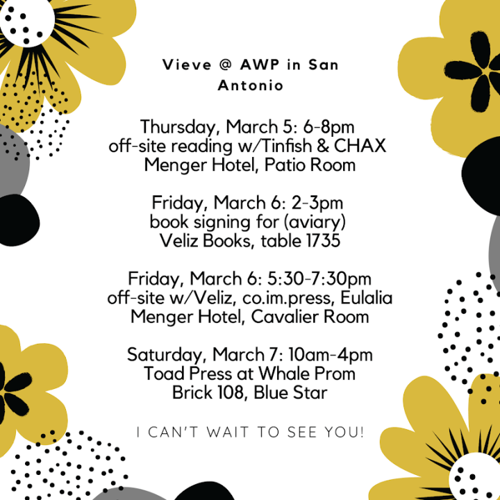 I’m so excited to launch my new book of poetry (aviary) at this year’s Association of Writers and Writing Programs (AWP) conference in San Antonio, TX this month!