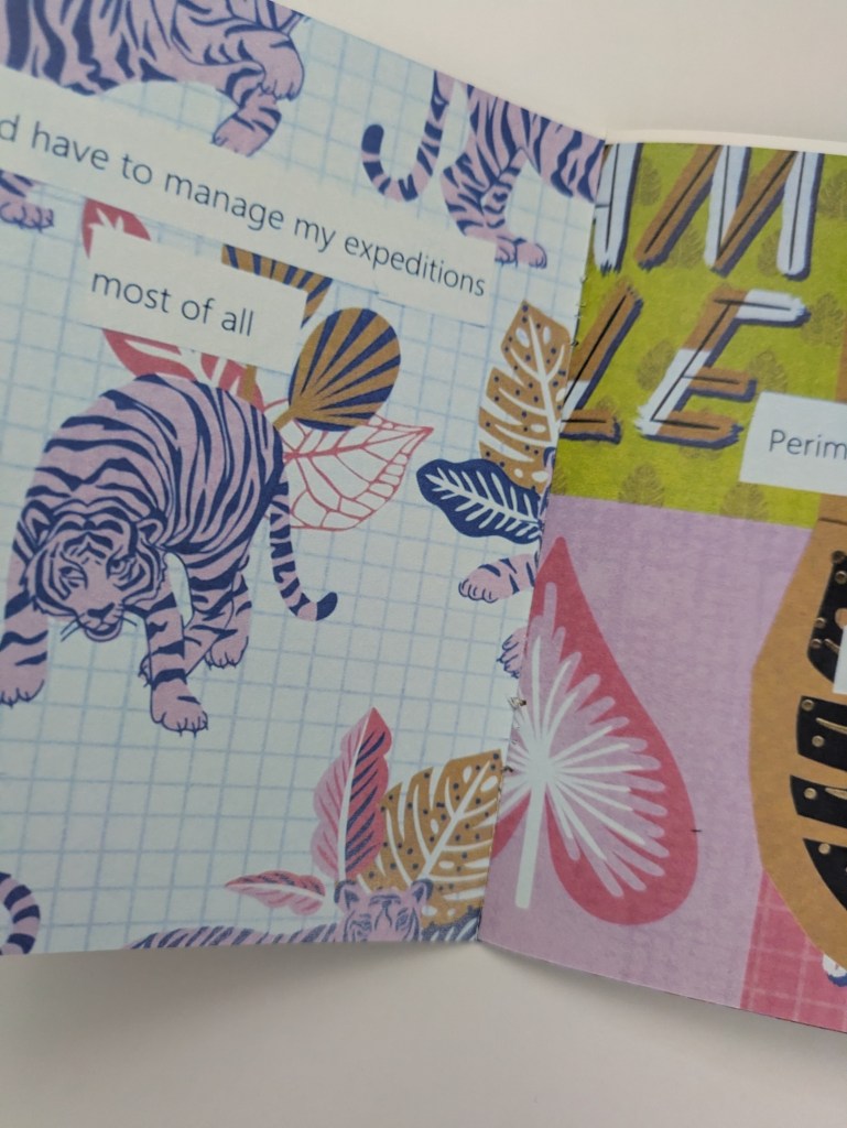 I also created a poem-zine, “I’d have to manage my expectations.” This full color zine is a single poem I wrote, Oulipo-inspired, with background tiger and other images from a themed paper pad. It’s bright! And I learned a lot making this one.